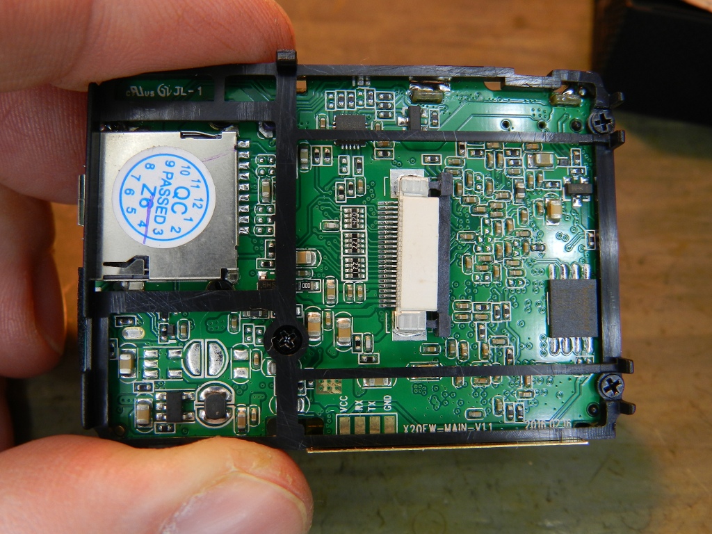 O vídeo abaixo demonstra como foi feita a abertura inicial, observe que TODOS os parafusos devem ser retirados, não só os das laterais. Desmontada a tampa interna, descolar com cuidado a antena WiFi. Depois (não é mostrado no vídeo), pode-se desencaixar o lado das tomadas USB e HDMI, afastando com cuidado a parte plástica do lado dos conectores e puxando a parte eletrônica.