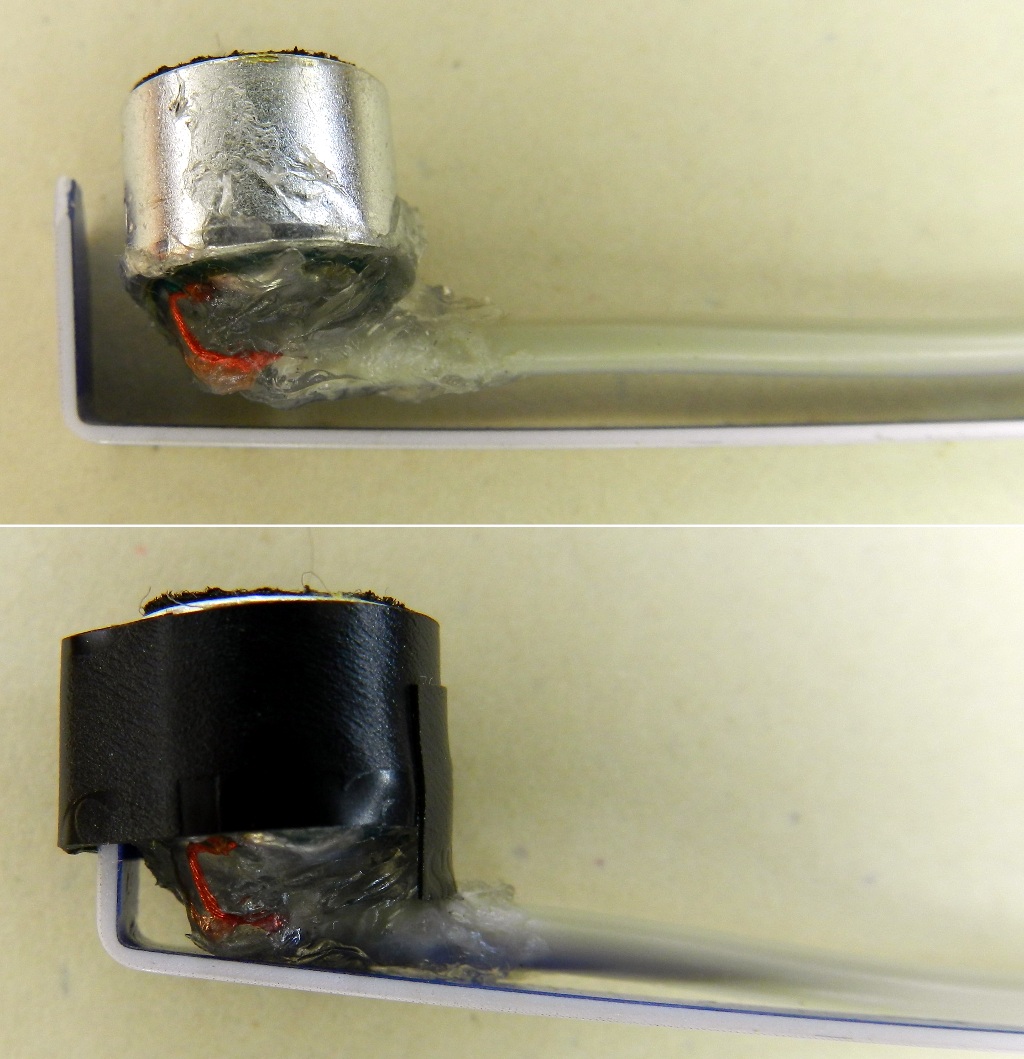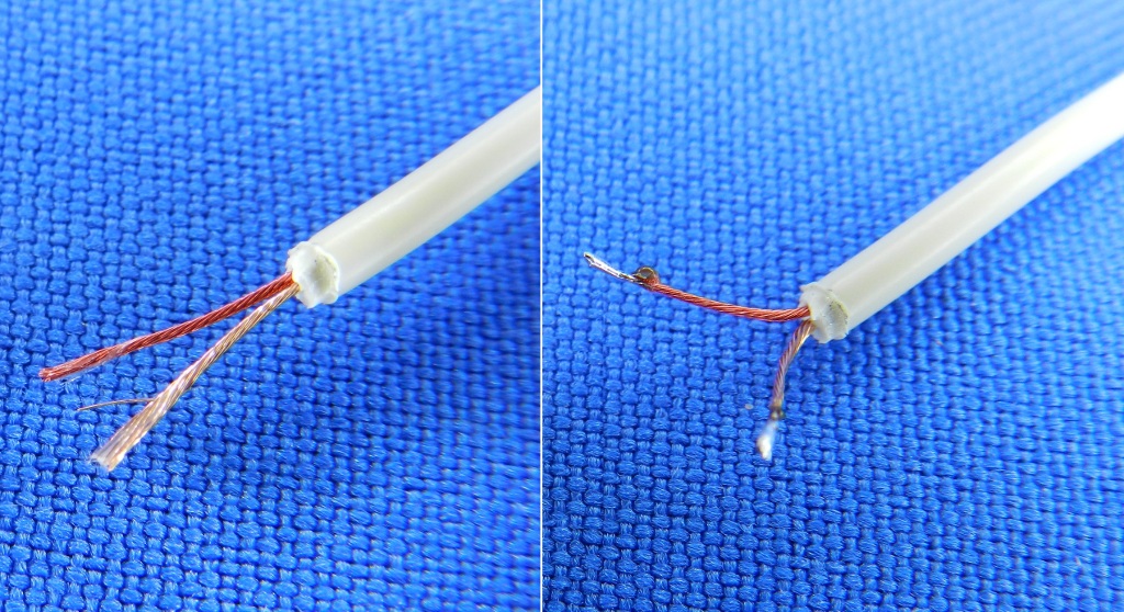 O cabo blindado que liga o jack é bem fino, era utilizado para conexão da cápsula de toca-discos Philips (as eletrolas). Ele é composto por dois fios internos, com uma camada de malha de cobre trançado, que funciona como blindagem contra interferências, mais uma capa de silicone transparente (figura 22).
