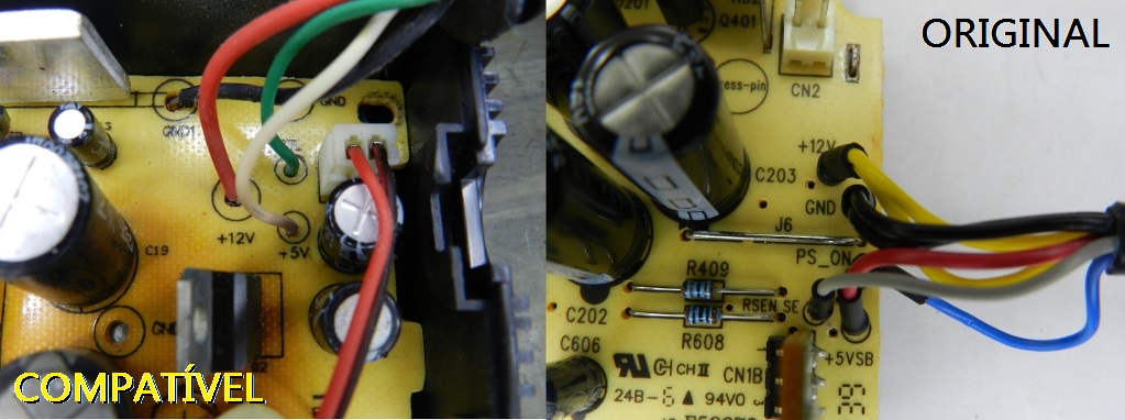 Além disso, as cores dos fios de conexão com a console não são as mesmas utilizadas pela fonte original, como demonstra a figura 11. No modelo compatível, o fio branco corresponde ao +5Vsb (StandBy – tensão sempre presente), o vermelho ao +12V, o verde é do CTL (PS_ON) e o preto é o terra (ground, GND, cujo potencial é zero Volt).