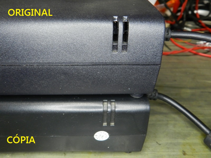 Figura 2 – Etiquetas de fontes para o XBOX 360 S. A da direita é o original, a da esquerda é a cópia, de marca desconhecida e bivolt automático.