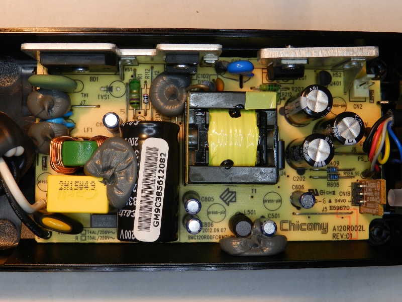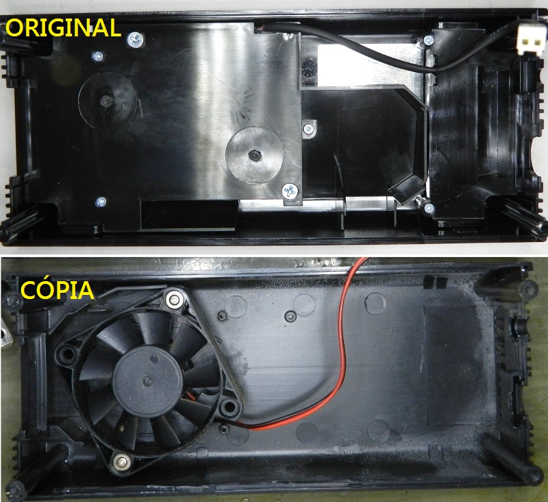 A fonte compatível deixa a desejar, por exemplo, na ventilação dos componentes. Comparando com a original (figuras 2 a 6), há menos aberturas de ar, o que pode piorar o desempenho em lugares quentes. Além disso, a ventoinha é montada na tampa, em cima do estágio primário, mas é o secundário que mais aquece, como se nota nas manchas escuras da placa (figura 7). A fonte original tem a ventoinha no mesmo lugar, mas há um caminho bem determinado para o fluxo de ar atingir as peças mais quentes. Inclusive, a ventoinha fica escondida na tampa.