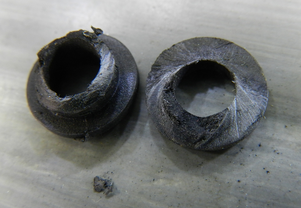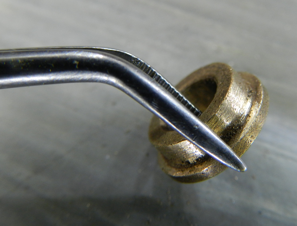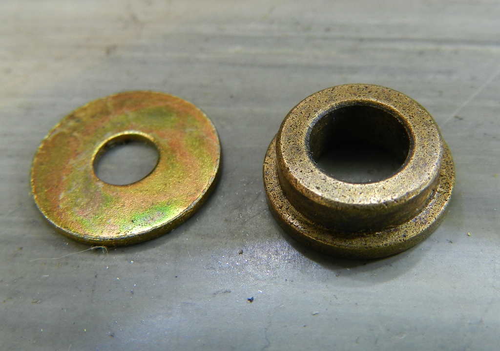Figura 9 – Detalhe da bucha sinterizada (peça à direita), junto com uma arruela de latão. Observe que a bucha é toda pigmentada, são os poros do material.