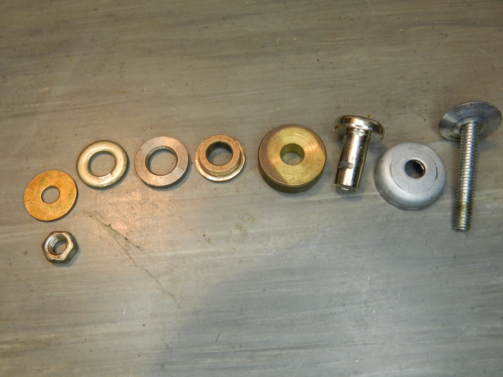 Figura 12 – Nova sequência de montagem, com a bucha sinterizada substituta do espaçador. As arruelas adicionais servem para ajustar a folga da bucha. A arruela de latão mais à esquerda só passa no parafuso e serve para prender firmemente o mancal contra a porca.
