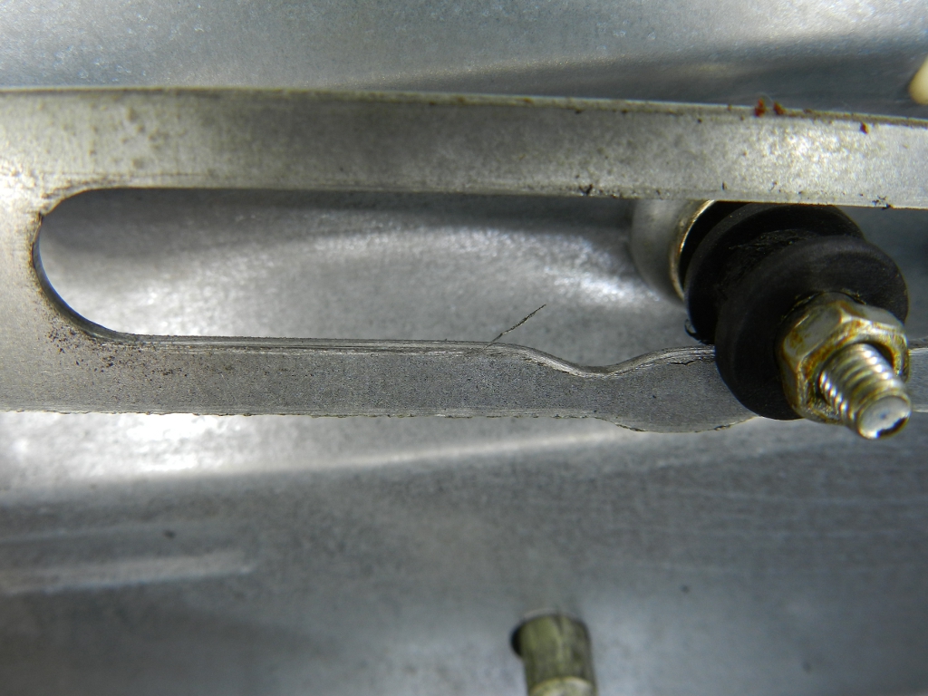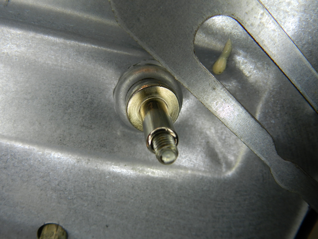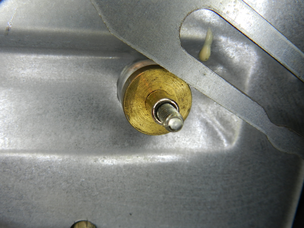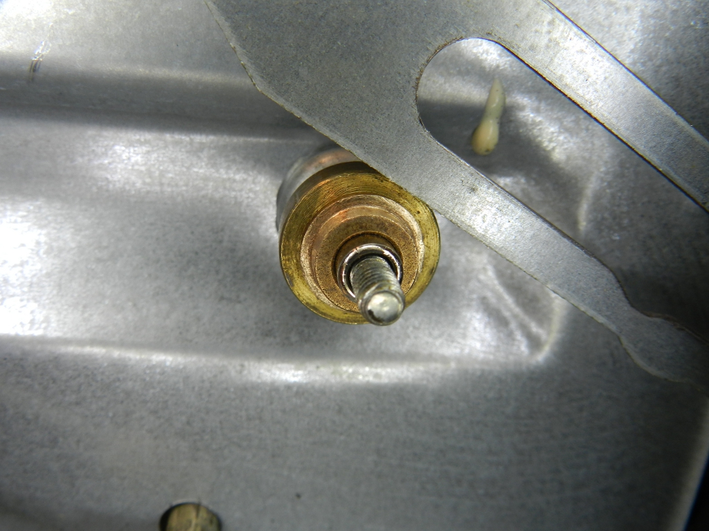 Ao abrir o aparelho, meio afobado, já comecei do jeito errado: pelo painel. Neste modelo, só precisa desmontar os pés e os parafusos da tampa, para ter acesso ao mecanismo de recolhimento da porta (figuras 3 e 4). Junto desse mecanismo havia resíduos que pareciam ser ferrugem, só que eram os restos de um espaçador, que havia rompido (figuras 5, 6 e 7). Este espaçador, em formato de H (quando visto perpendicularmente ao eixo), era o que suavizava o movimento de abertura da porta e impedia o atrito do metal com metal.