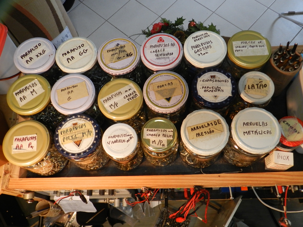 Além das desmontagens eventuais, também faço pequenas compras, que resultam num estoque razoável desses itens. Por isso, nunca me aperto. Periodicamente faço uma revisão, para segmentar mais o estoque ou para excluir alguns itens, que devido à evolução tecnológica, tornaram-se obsoletos, como foi o caso dos antigos parafusos autoatarrachantes cônicos para madeira. No caso dos elementos de fixação, reservo a parte de cima da bancada para guardá-los (figura 22):