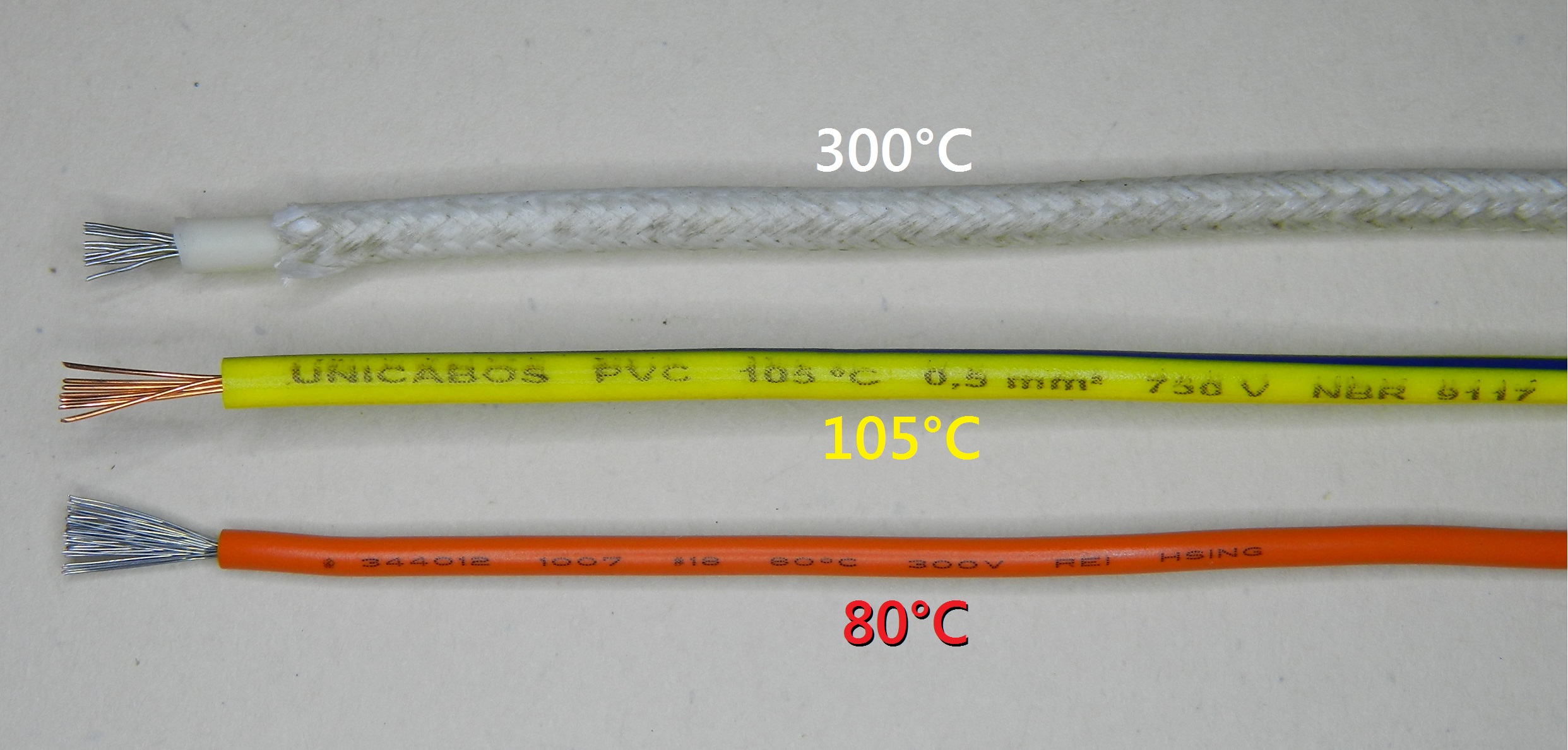 Figura 26 – Em cima, cabo com capa de silicone, coberto com malha de seda, indicado para alta temperatura (até 300°C), sem informação da tensão máxima. No meio, cabo de PVC para 105°C e 750V, certificado pela norma NBR 9117, usado em calhas de fluorescentes. Embaixo, cabo plástico para uso geral (até 80°C e 300V), retirado de fonte de PC.