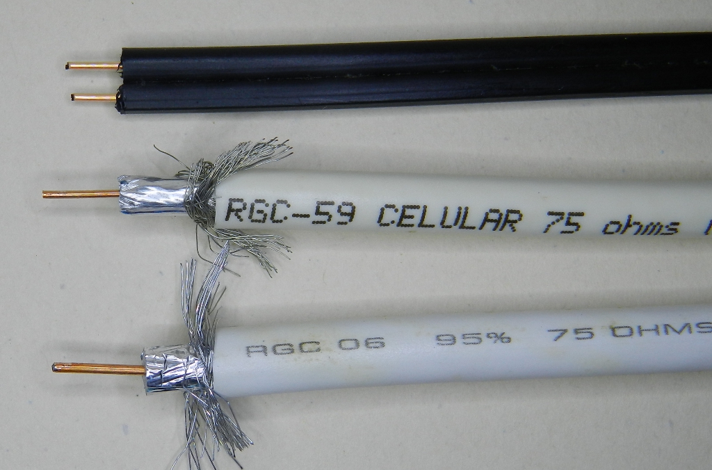 Figura 31 – Fios de aço com camada de cobre, utilizados para reforço da resina no botão. Em cima, par telefônico metálico de uso externo; no meio, cabo RGC-59 (recepção de satélite banda C); embaixo, cabo RGC-06 (recepção de banda Ku e sinal de operadoras de TV a cabo).