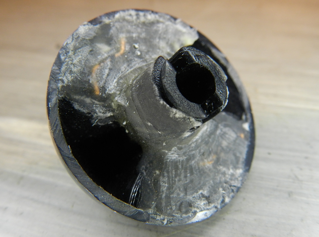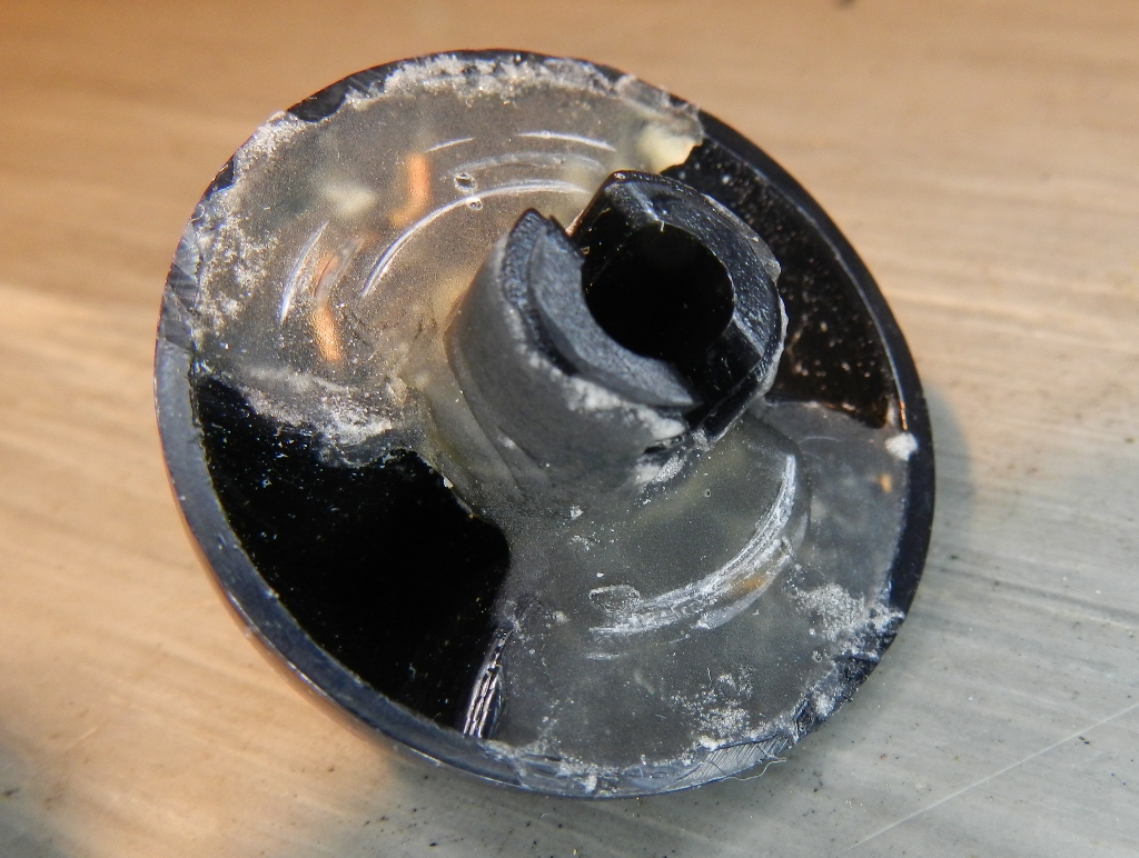 Os controles tem botões de baquelite, por causa do calor. Não derretem, mas podem quebrar (são vazados, em vez de maciços). Logo após a compra, arrebentou o botão do temporizador, tive que consertá-lo duas vezes, pois o esforço sobre esta peça é considerável (figura 30). A solução definitiva foi usar resina odontológica (conjunto de pó e líquido, de acrílico autopolimerizante), com a adição de pedaços de fio de aço cobreado, daqueles pares metálicos pretos, das linhas telefônicas. Cabos como o RGC-59 ou RGC-06 também têm fios de aço cobreado e podem ser utilizados (figura 31). Para conhecer a técnica de uso da resina odontológica, acesse os posts AQUI e AQUI.