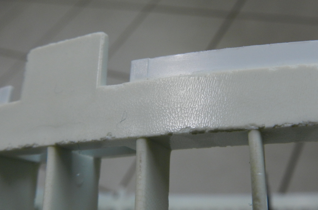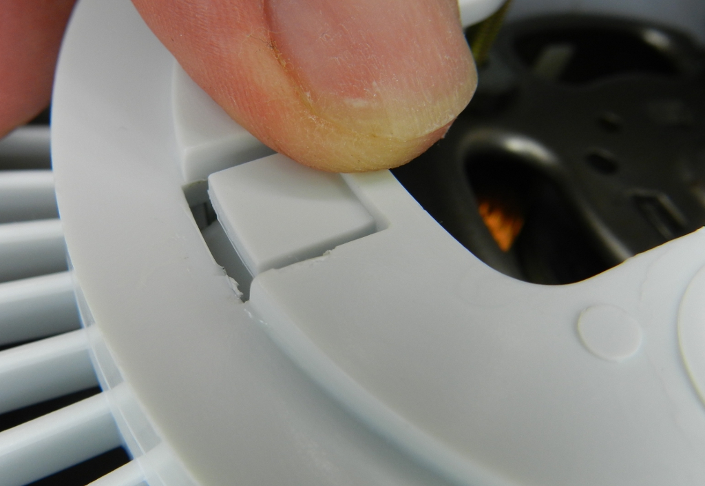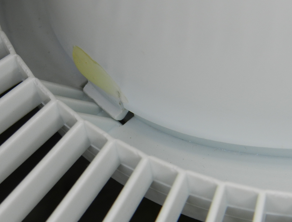 Figura 46 – Detalhe da grade traseira de um ventilador de mesa. Pode-se ver que a parte exposta à luz está craquelada e mais amarelada, diferente da parte coberta pela grade frontal (é a mesma peça plástica).