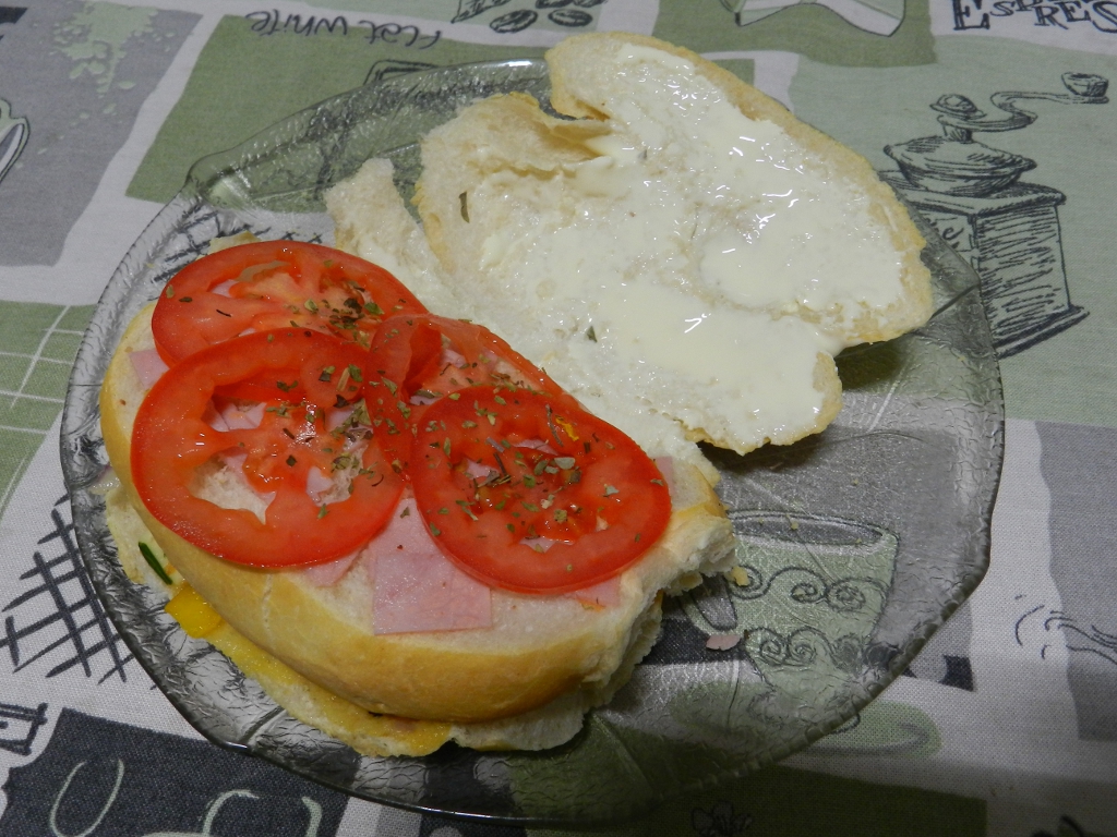 – No corte superior, colocar o presunto, os tomates e polvilhar com o orégano. Deitar (a gosto) mais um fio de azeite sobre os tomates.