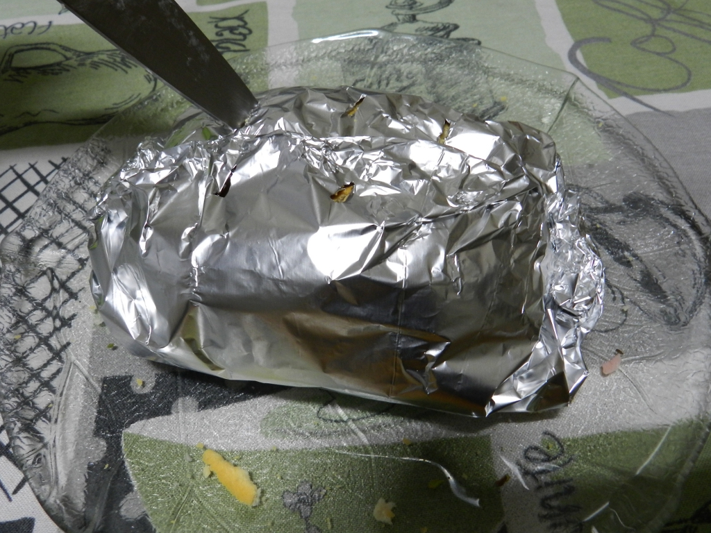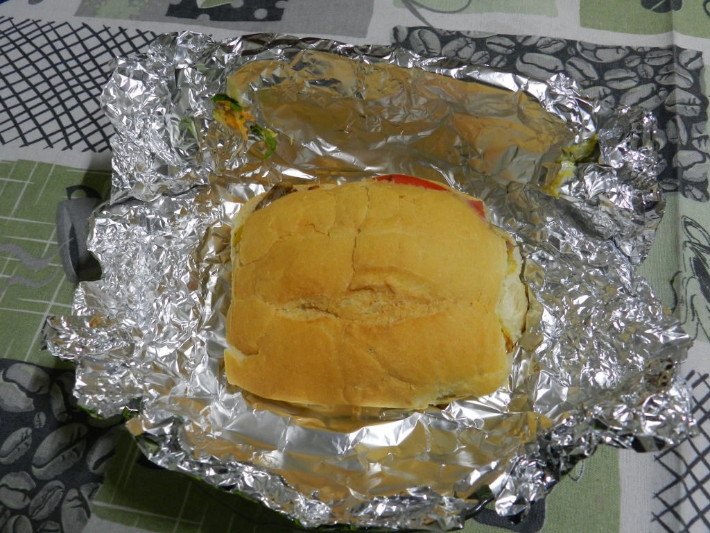 Figura 53 – Sanduíche já embrulhado no alumínio e pronto para ir ao forno. Observe os furos em cima, feitos com a ponta de uma faca.