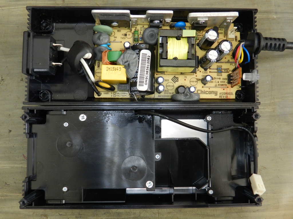 Fig. 10 – Vista da placa da fonte do XBOX 360S com sua tampa, onde é possível perceber que o capacitor vazou por todo lugar.