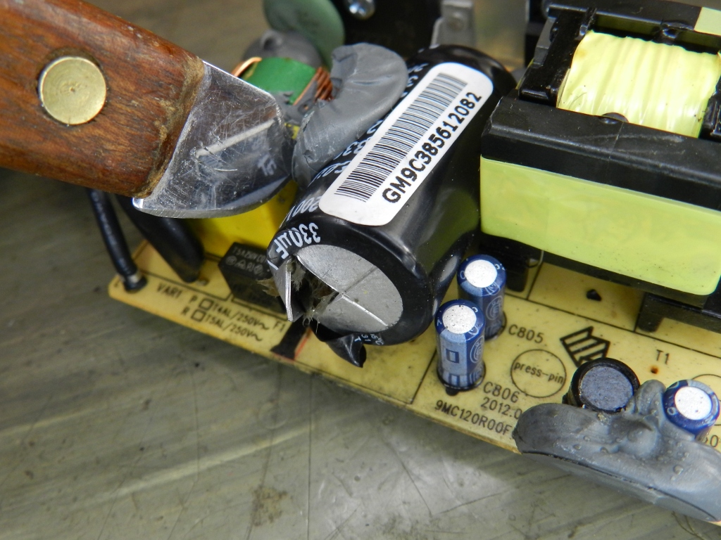 Passados poucos segundos, se o varistor não queimar, o capacitor eletrolítico de entrada da fonte explode e vaza o eletrólito (fig. 1) e então queima o fusível. É disso que vamos tratar hoje.