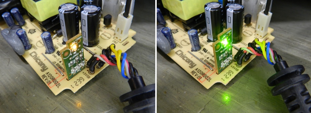 Fig. 13 – À esquerda, fonte ligada somente na tomada (luz laranja). À direita, fonte em funcionamento normal (luz verde).