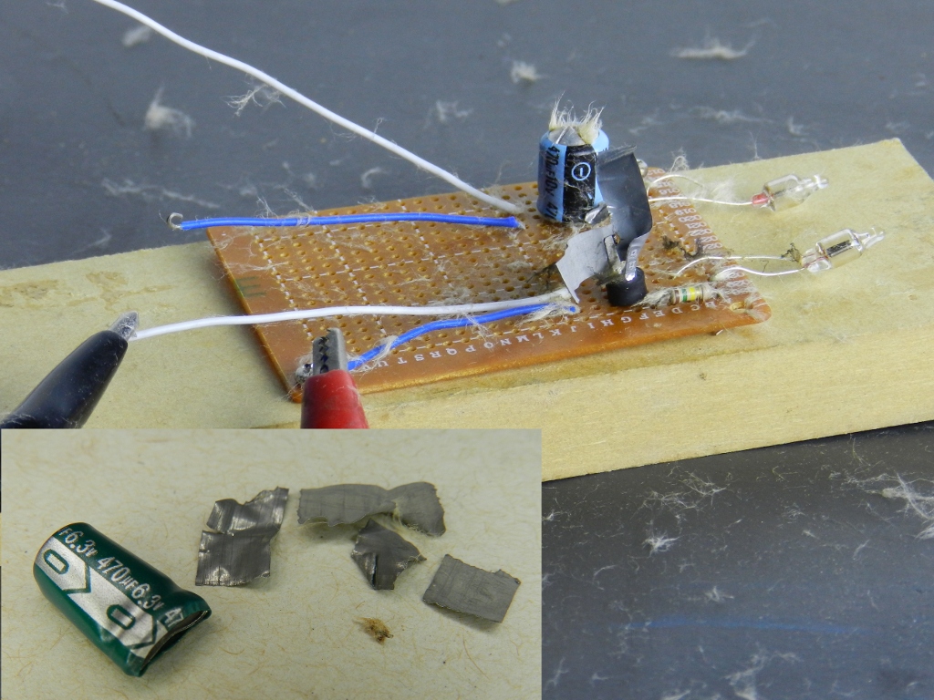 Nas cenas iniciais, mais claras, os capacitores foram expostos a 40VCC, o segundo deles recebeu tensão invertida. Na sequência, as cenas mais escuras mostram outros dois capacitores, recebendo 300VCC, o último também recebeu a tensão invertida. A figura 7 mostra o resultado das explosões e o estado em que ficou a caneca do capacitor verde, que bateu em um obstáculo 2 metros acima da placa.